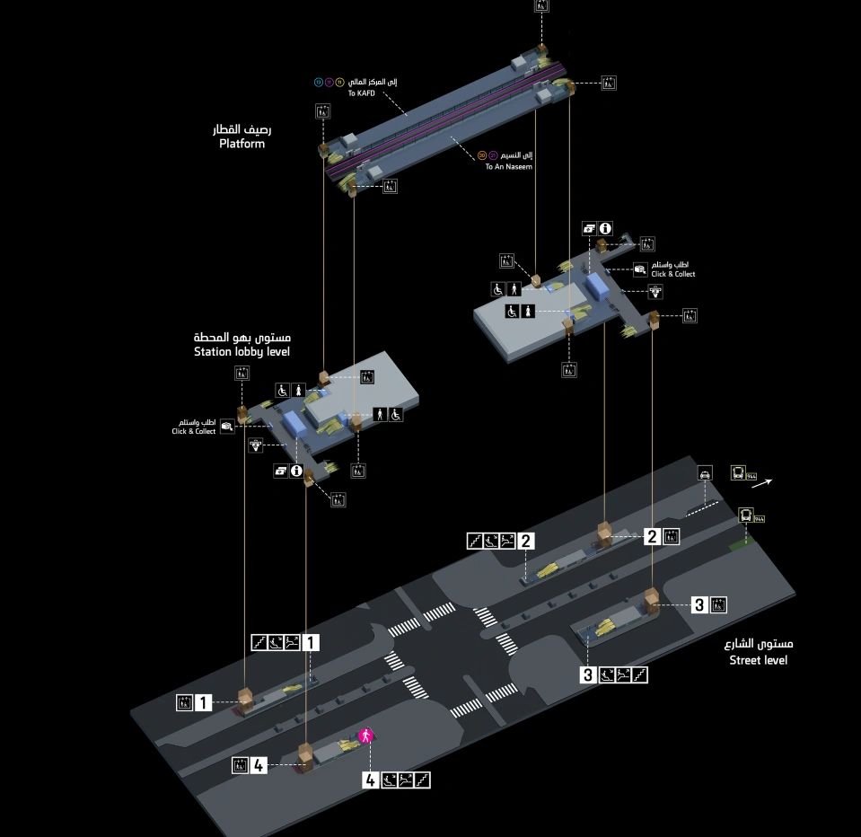 استكشف تخطيط المحطة ووسائل الراحة باستخدام الخريطة
