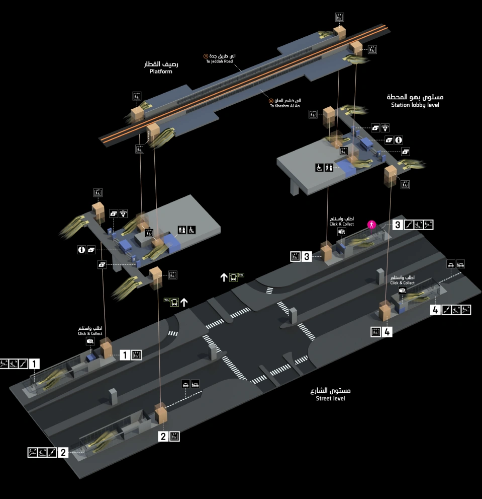 استكشف تخطيط المحطة ووسائل الراحة باستخدام الخريطة