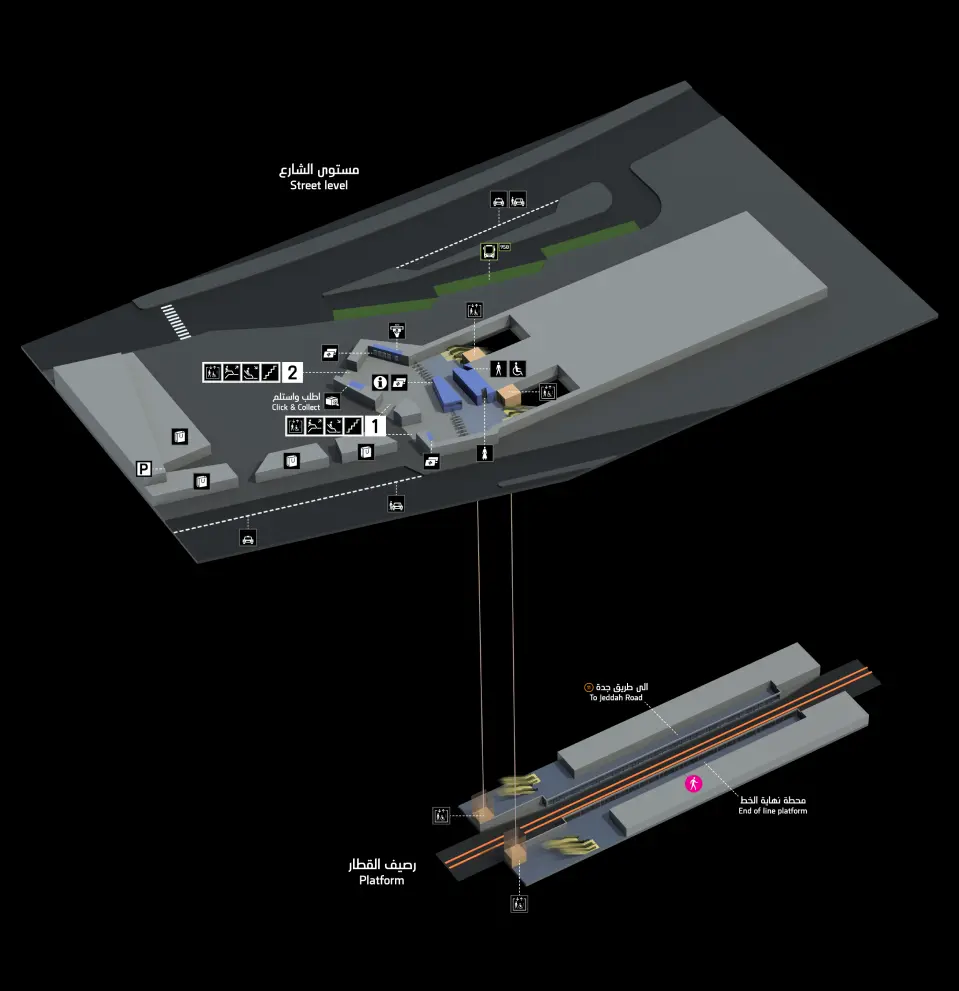استكشف تخطيط المحطة ووسائل الراحة باستخدام الخريطة